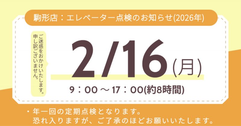 駒形店:エレベーター点検による停電のお知らせ【2026年2月16日(月)】