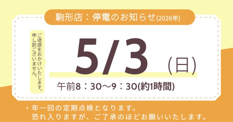 駒形店:定期点検による停電のお知らせ【2026年5月3日(日)】 2026.03.26 新着情報 2026年5月3日(日)は、駒形店入居ビルが設備保守点検による全館停電のため、 午前8:30~9:30の約1時間、停電となります。 お客様にはご迷惑をおかけし、申し訳ございません。 作業完了後は順次復旧いたします。 上記日程に、お荷物の取り出し・ご収納のご予定がございましたら、 ご留意いただきますよう何卒よろしくお願い申し上げます。 いつも弊社トランクルームをご利用いただき、誠にありがとうございます。 関連記事 【3月15日オープン!】トランクルーム/23号 竜泉店 【3月25日オープン!】トランクルームピエロ/ 徳丸4丁目店 【8月30日オープン!】トランクルーム/弁天町店 一覧に戻る